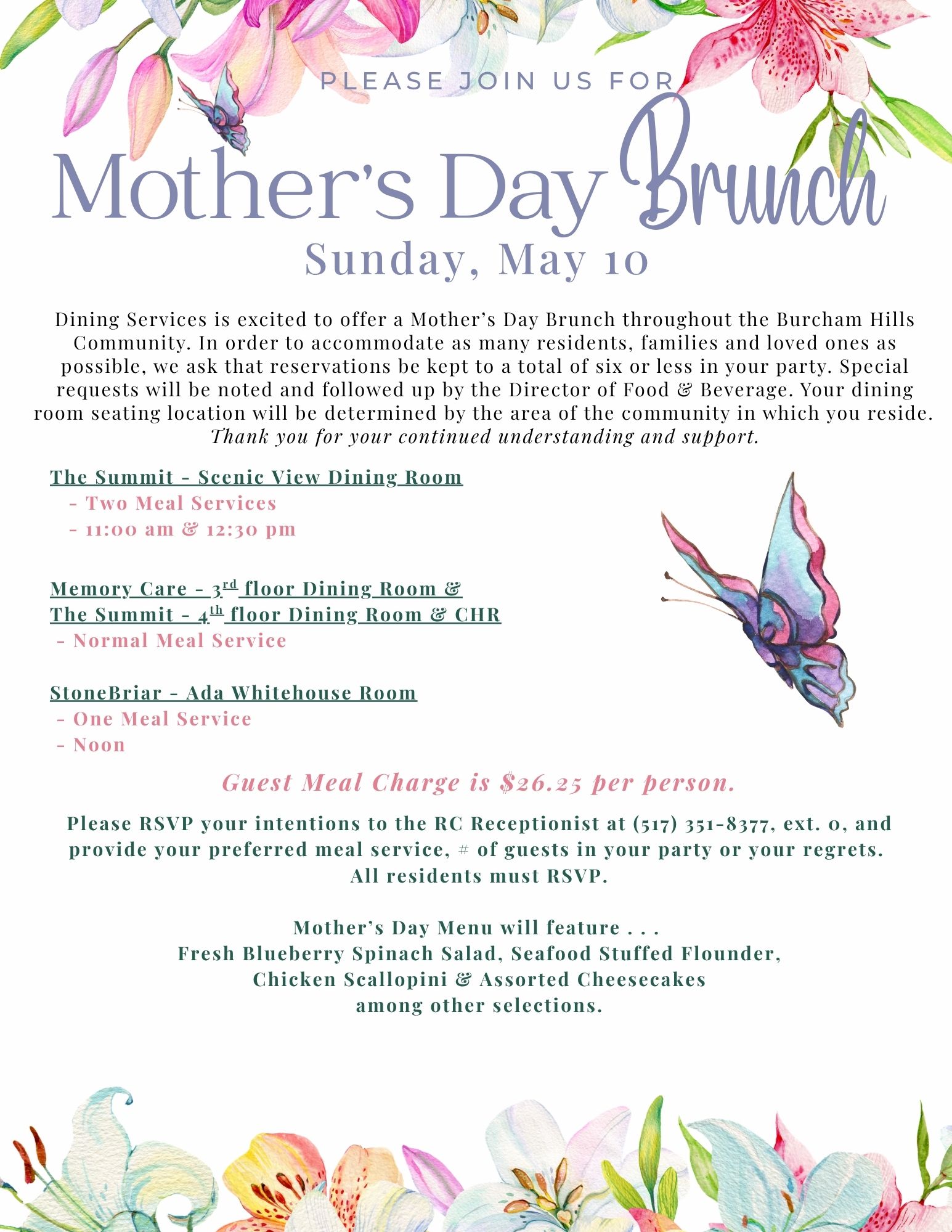 Burcham Calendars and Events Last updated on April 20th, 2026 at 04:45 pm Calendars, Menus and Newsletters Cornerstone Bistro Menu Scenic View Dining Room Menu - week of April 19, 2026 Scenic View Dining Room Menu - week of April 26, 2026 Cornerstone Bistro Weekly Specials - week of April 20, 2026 Cornerstone Bistro Weekly Specials - week of April 27, 2026 Mother's Day Brunch Burcham Beacon - April 2026 The Summit Calendar - April 2026 Memory Care Calendar - April 2026 CHR Calendar - April 2026 StoneBriar Flyer - April 2026 StoneBriar Calendar - April 2026